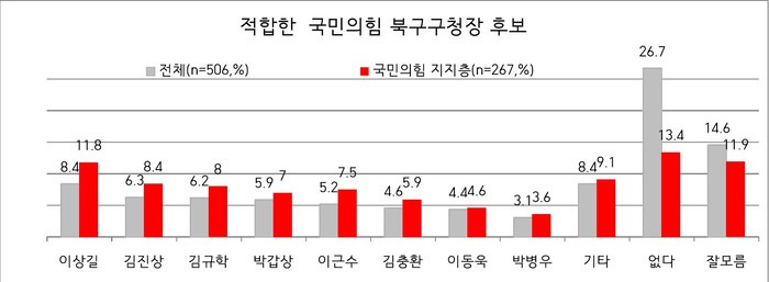 * 이번 조사는 브레이크뉴스대구경북 의뢰로 알앤써치가 2월 7일부터 8일까지 이틀간 대구 북구 거주 만 18세 이상 남녀 506명을 대상으로 실시했다. 무선 ARS(98.6%) 및 유선 ARS(1.4%) 방식으로 진행됐으며, 표본오차는 95% 신뢰수준에 ±4.4%p, 응답률은 6.1%다.