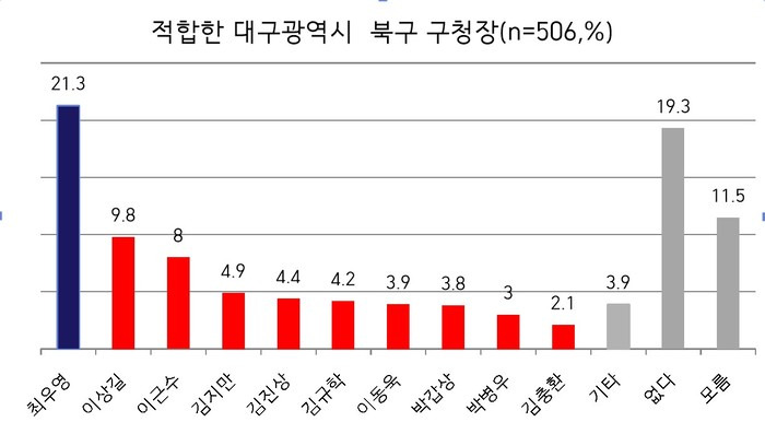 더불어민주당 최우영 북구을 지역위원장 21.3%, 이상길 전 대구시 행정부시장 9.8%, 이근수 전 북구 부구청장 8.0%, 김지만 시의원 4.9%, 김진상 전 국장 4.4%, 김규학 전 시의원 4.2%, 이동욱 시의원 3.9%, 박갑상 전 시의원 3.8%, 박병우 전 이사장 3.0%, 김충환 전 원장 2.1%
