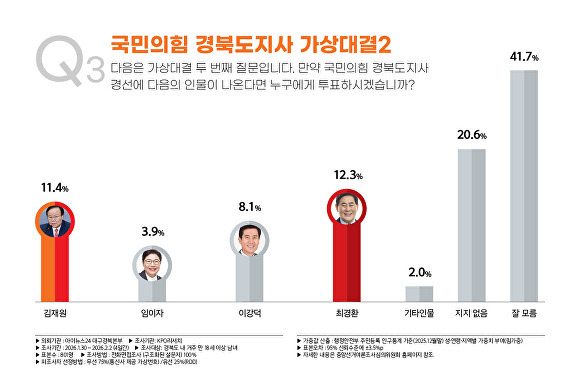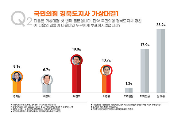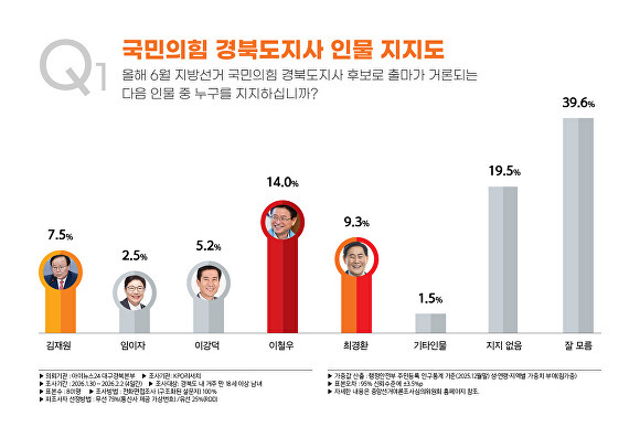 이철우 14.0%, 최경환 9.3%, 김재원 전 국회의원 7.5%, 이강덕 포항시장 5.2%, ‘지지 인물 없음’ 19.5%, ‘잘 모름’ 39.6%