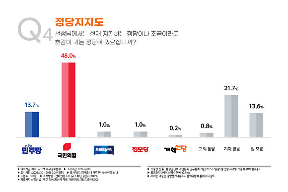국민의힘 48.0%, 민주당 13.7%, 조국혁신당 1.0%, 진보당 1.0%, 개혁신당 0.2%