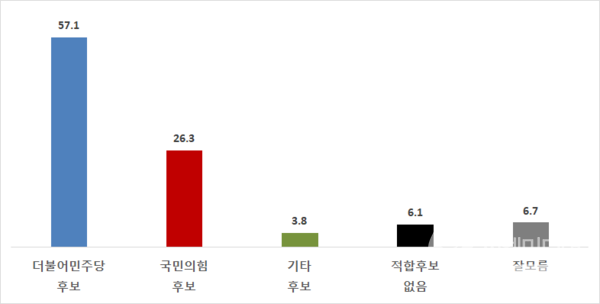 더불어민주당 후보에게 투표하겠다 57.1%, 국민의힘 후보에게 투표하겠다 26.3%, 기타후보 3.8%, 적합후보 없음 6.1%, 잘 모름 6.7%