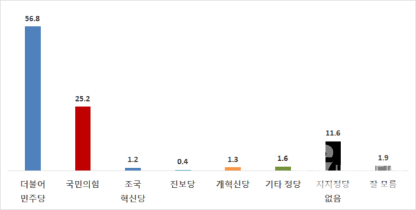 더불어민주당 56.8%, 국민의힘 25.2%, 개혁신당 1.3%, 조국혁신당 1.2%, 진보당 0.4%, 기타정당 1.6%, 지지정당 없음 11.6%, 잘 모름 1.9%