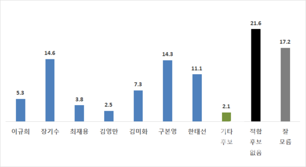장기수 정책위원회 부의장 14.6%, 구본영 전 천안시장 14.3%, 한태선 전 청와대 행정관 11.1%, 김미화 중앙당 부대변인 7.3%, 이규희 전 국회의원 5.3%, 최재용 전 소청심사위원장 3.8%, 김영만 천안미래희망제작소 대표 2.5%, 기타후보 2.1%, 적합후보 없음 21.6%, 잘 모름 17.2%