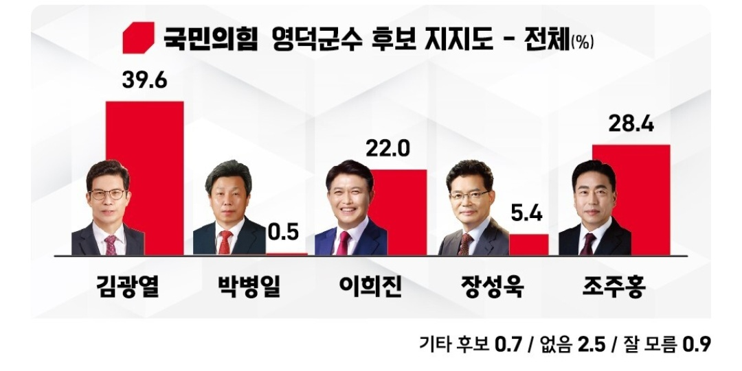 2022년 지방선거 경북 영덕군수 후보군 및 지지율 여론조사 모음 2022년 지방선거 경북 영덕군수 후보군 및 지지율 여론조사 모음---------- 국민의힘 김광열·이희진·황재철 3인 경선 결정! ----------