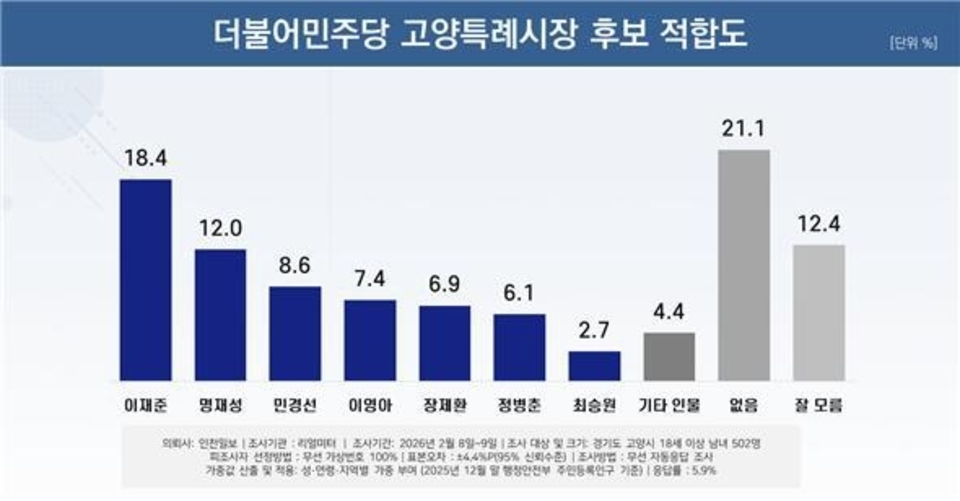 * 이번 조사는 인천일보 의뢰로 여론조사기관 ㈜리얼미터가 2026년 2월 8~9일 이틀간 고양시 거주 만 18세 이상 남녀 502명을 대상으로 무선 전화 가상번호를 이용한 자동 응답(ARS) 방식으로 진행했다. 표본오차는 95% 신뢰 수준에서 ±4.4%포인트다. 응답률은 5.9%다. 자세한 조사 결과는 중앙선거여론조사심의위원회 누리집에서 확인할 수 있다.