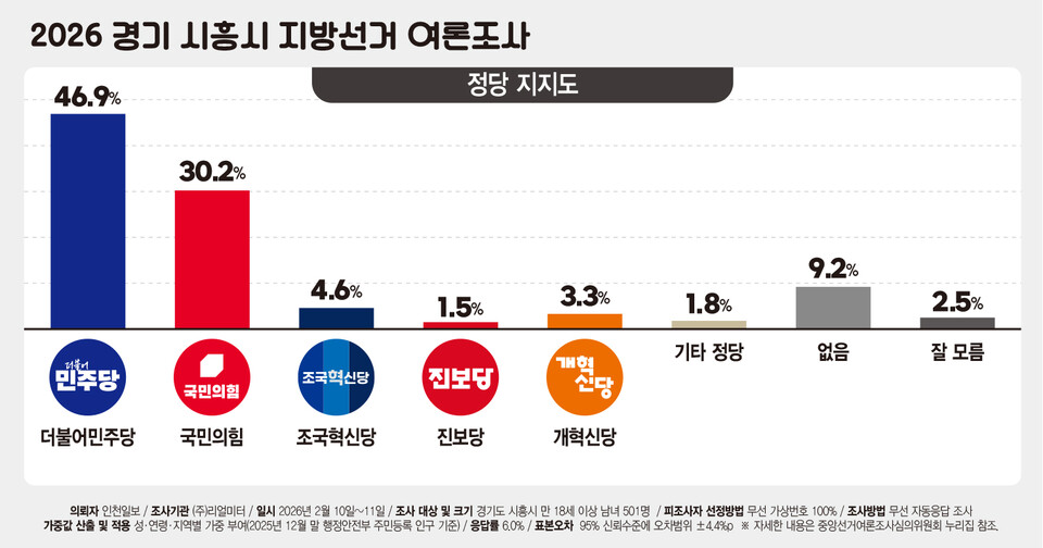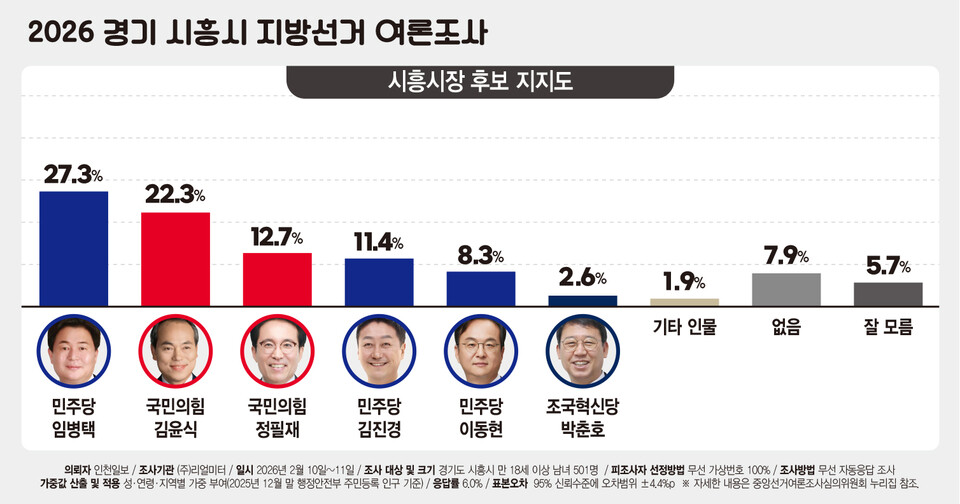 * 이번 조사는 인천일보 의뢰로 여론조사기관 ㈜리얼미터가 2026년 2월 10~11일 이틀간 시흥시 거주 만 18세 이상 남녀 501명을 대상으로 무선 전화 가상번호를 이용한 자동 응답(ARS) 방식으로 진행했다. 표본오차는 95% 신뢰수준에서 ±4.4%포인트다. 응답률은 6.0%다. 자세한 조사 결과는 중앙선거여론조사심의위원회 누리집에서 확인할 수 있다.