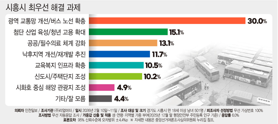 '광역 교통망 개선·버스 노선 확충' 30.0%, '첨단산업 육성·청년 고용 확대' 15.1%, '공공·필수의료 체계 강화' 13.1%, '낙후지역 개선·재개발 추진' 11.7%, '교육복지 인프라 확충' 10.5%, '신도시·주택단지 조성' 10.2%, '시화호 중심 해양 관광지 조성' 4.9%, '기타·잘 모름' 4.4%
