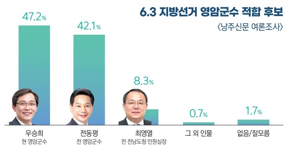 우승희 군수 47.2%, 전동평 전 군수 42.1%, 최영열 전 전남도청 종합민원실장 8.3%, 없음·잘 모름 1.7%