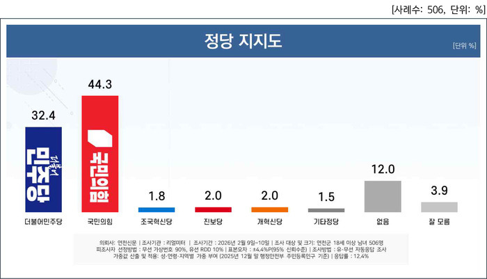 국민의힘 44.3%, 더불어민주당 32.4%, 조국혁신당 1.8%, 진보당 2.0%, 개혁신당 2.0%, 기타정당 1.5%, 없음(지지정당 없음) 12.0%, 잘 모름 3.9%