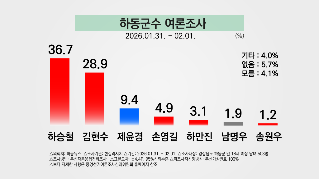 * 이는 하동뉴스가 한길리서치에 의뢰하여 2026년 01월 31일부터 02월 01일까지 이틀간 하동군민 503명을 대상으로 무선자동응답전화조사로 진행됐다. 보다 자세한 사항은 중앙선거여론조사심의위원회 홈페이지를 참조하면 된다.