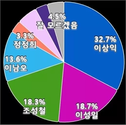 이상익 32.7%, 이성일 18.7%, 조성철 18.3%, 이남오 13.6%, 정정희 3.3%, 다른 인물 5.5%, 잘 모르겠음 4.5%, 적합 후보 없음 3.3%