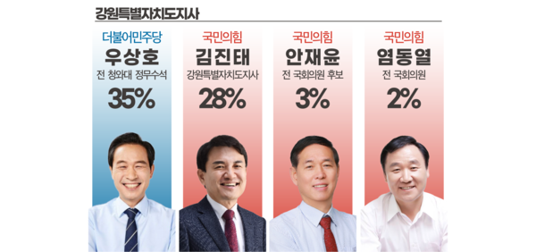 더불어민주당 우상호 전 청와대 정무수석 35%, 국민의힘 현 김진태 지사 28%, 안재윤 전 국회의원 후보 3%, 염동열 전 국회의원 2%, 없다 17%, 모름 15%