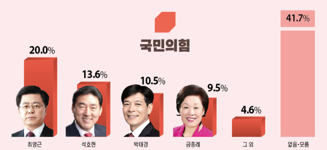 최영근 전 시장 20.0%, 석호현 부위원장 13.6%, 박태경 전 화성시 민생경제산업국장 10.5%, 금종례 현 국민의힘 경기도당 수석대변인 9.5%, 그 외 인물 4.6%, ‘없음’ 28.1%, ‘모름’ 13.6%