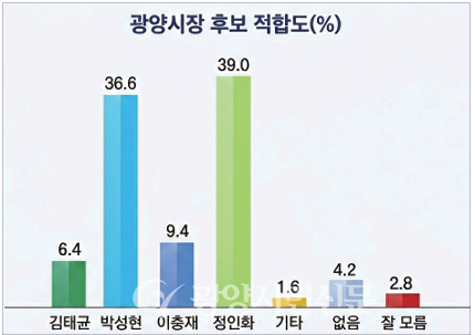 정인화 현 광양시장 39.0%, 박성현 전 여수광양항만공사 사장 36.6%, 이충재 현 더불어민주당 당대표 특별보좌역 노동특보 9.4%, 김태균 현 전남도의회 의장 6.4%, 기타 인물 1.6%, 적합한 인물이 없음 4.2%, 잘 모르겠다 2.8%