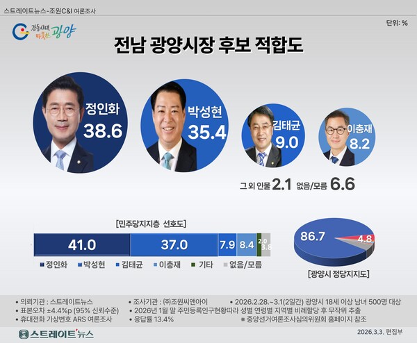 * 이번 조사는 스트레이트뉴스 의뢰로 조원씨앤아이가 2026년 2월 28일~3월 1일 2일간 전라남도 광양시 거주 18세 이상 남녀 대상으로 ARS 여론조사(휴대전화 가상번호 100%, 성, 연령대, 지역별 비례할당 무작위 추출)를 실시한 결과다. 표본수는 500명(총 통화시도 3743명, 응답률 13.4%), 표본오차는 95% 신뢰수준에 ±4.4%포인트다. 그 밖의 사항은 중앙선거여론조사심의위원회 홈페이지 참조.