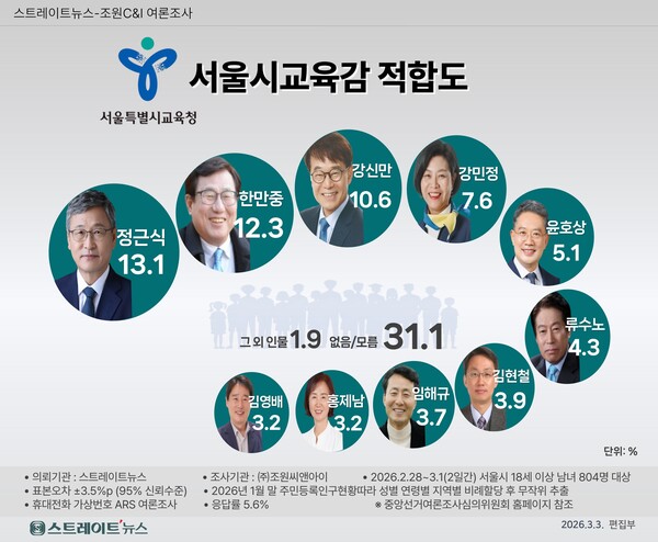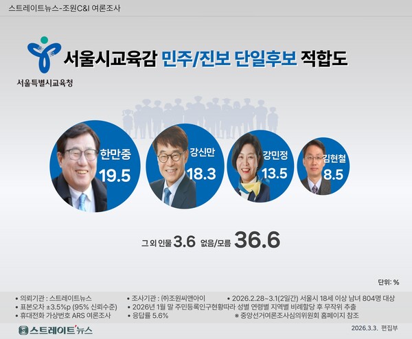 * 이번 조사는 스트레이트뉴스 의뢰로 조원씨앤아이가 2026년 2월 28일~3월 1일 2일간 서울특별시 거주 18세 이상 남녀 대상으로 ARS 여론조사(휴대전화 가상번호 100%, 성, 연령대, 지역별 비례할당 무작위 추출)를 실시한 결과다. 표본수는 804명(총 통화시도 14271명, 응답률 5.6%), 표본오차는 95% 신뢰수준에 ±3.5%p다. 그 밖의 사항은 중앙선거여론조사심의위원회 홈페이지 참조.
