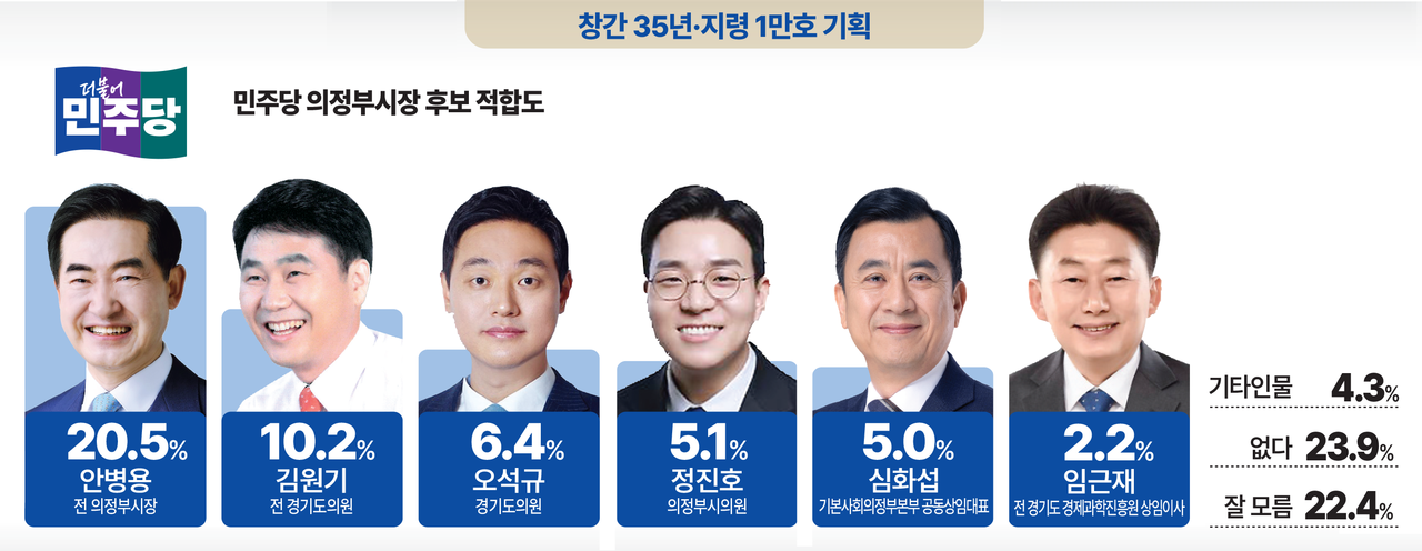 안병용 전 시장 20.5%, 김원기 전 경기도의원 10.2%, 오석규 경기도의원 6.4%, 정진호 의정부시의원 5.1%, 심화섭 사단법인 기본사회 의정부본부 공동상임대표 5.0%, 임근재 전 경기도경제과학진흥원 상임이사 2.2%, ‘적합한 후보가 없다’ 23.9%, ‘잘 모른다’ 22.4%