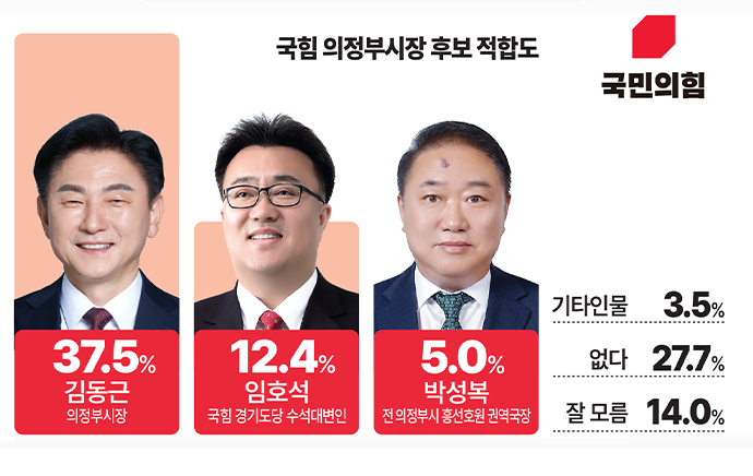 김동근 시장 37.5%, 임호석 국민의힘 경기도당 수석대변인 12.4%, 박성복 전 의정부시 흥선호원 권역국장 5.0%, 기타인물 3.5%, 적합인물없다 27.7%, 잘 모름 14.0%